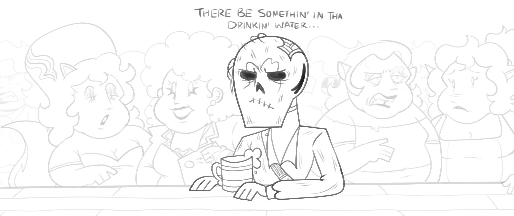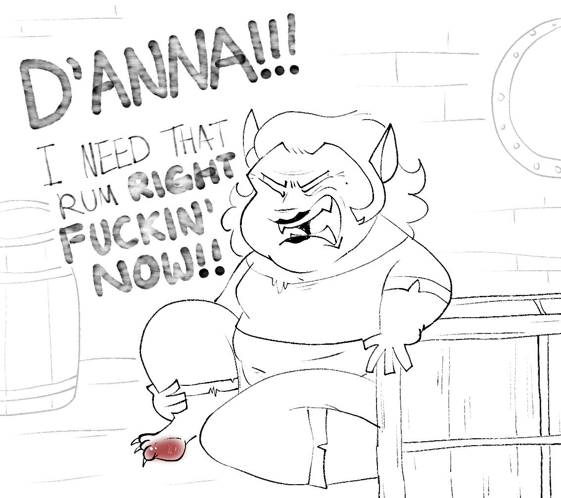The skeletal captain of the Festering Wound who’s recently finished his fifteen-year-long marination at the bottom of the ocean. A pirate for extremely personal reasons, nothing can stop his vengeance—not even death!Cain stands at 6’3,” which would be a lot more intimidating if he had some muscle to go along with it. His clothes, along with his boney physique, are weathered from the fifteen-year-long brine he took at the bottom of the Soval Sea. He wears a pouch on his belt, something that every member of the Festering Wound is required to wear. Half of its contents are small, spherical bullets for pistols, and the other half is filled with nails in which to patch up the ship.