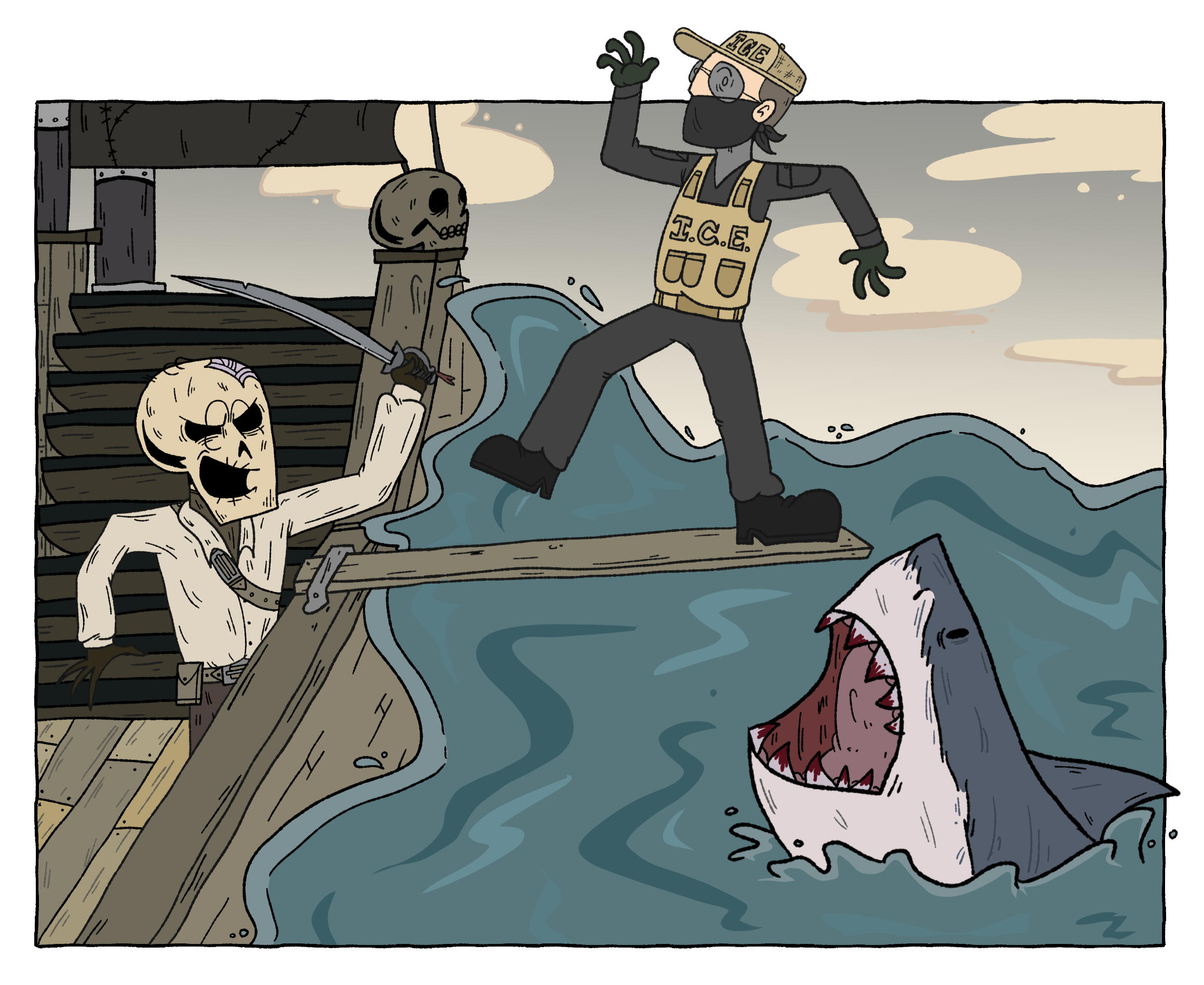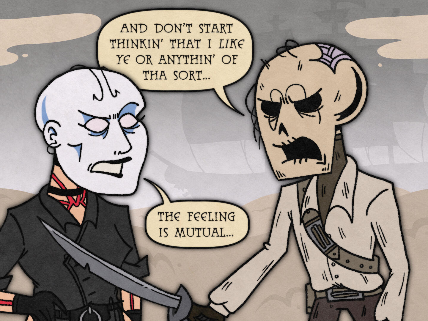 Pirates do not have a government. Instead, they operate by “If you mess with me, I will stab you and take all of your stuff.” This is a pretty effective strategy, since it’s far easier to take down a merchant vessel over a fellow pirate. Not only is it far more work, but you’ll also get less out of it, since pirates would rather destroy every piece of treasure than let anyone else have it.Pirates are the #1 enemy of practically any powerful group in Stashwick (Most importantly the Horatio Empire, the Kodos Konfederation, and the McCoy and Spiner Company). Pirate waters are hard to conquer, and there’s a lot less profit for you if your shit is constantly getting stolen. Captured pirates are fated to the gallows.The pirates aren’t necessarily good guys, but if they’re fucking over the evil invaders and greedy capitalists, than they look pretty noble. (Even though pirates are greedy capitalists. They’re just cooler ones.)One of the most popular pirate ports in Stashwick is Saint Khan’s Port. It’s like a mirror-universe version of Port Bashir; where Port Bashir is clean and everybody is bound by law, Saint Khan’s Port is a chaotic mess where the only law is “Navies fuck off.”