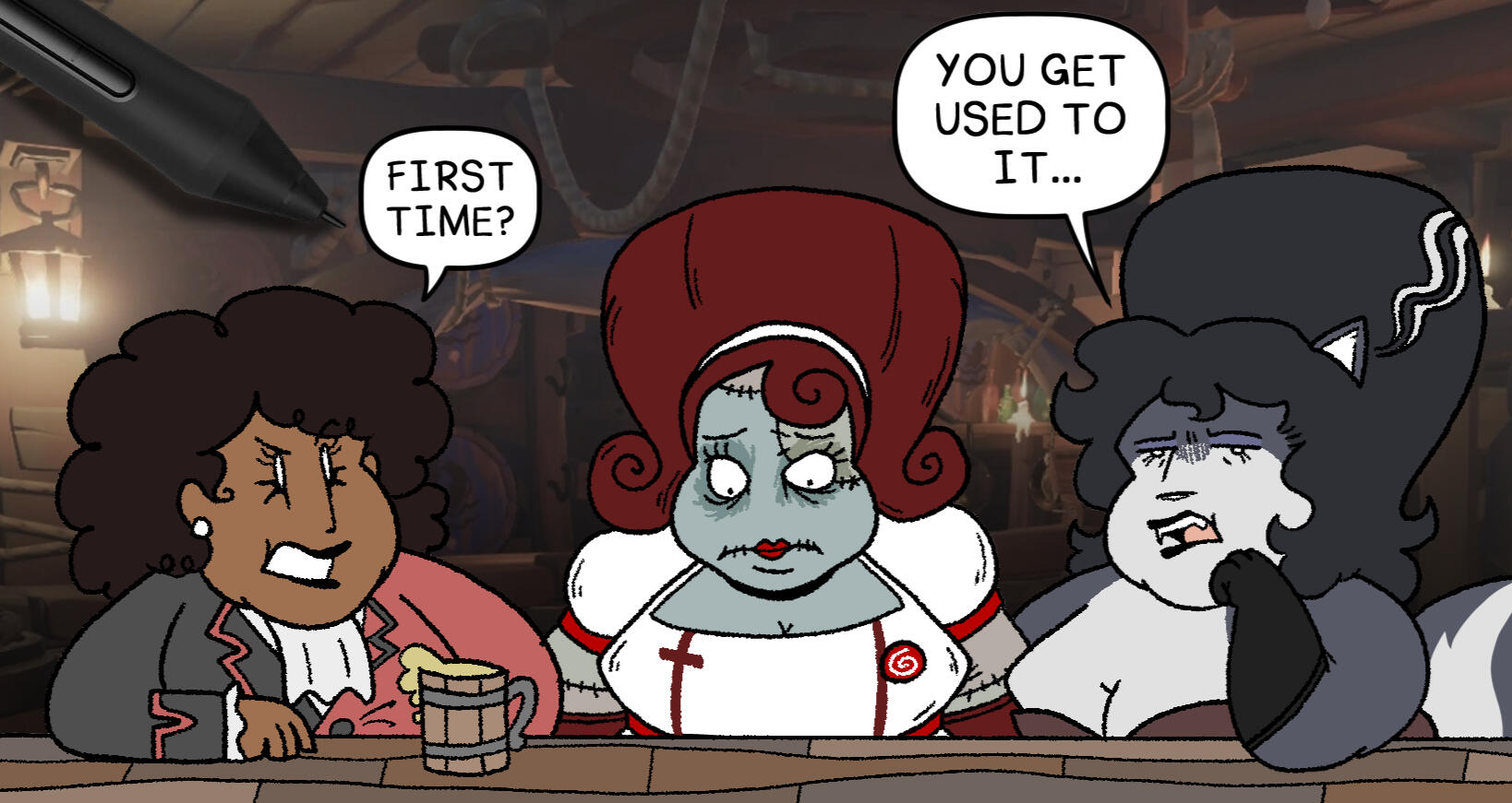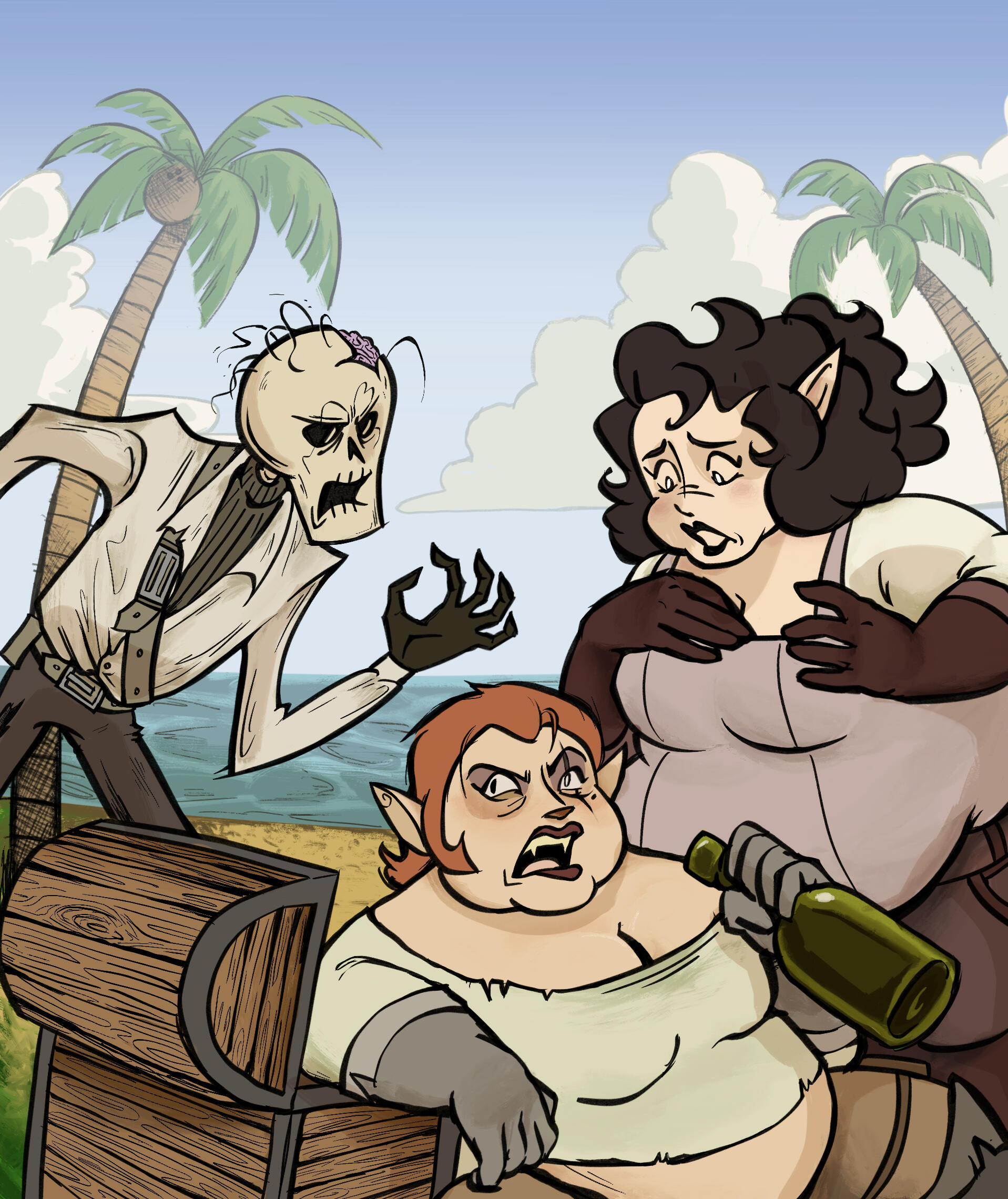 The world of Boarding Party is one that’s stuck in a 17th century-esqe setting where the golden age of piracy never ended. It is a large, terrestrial planet whose surface is mostly water. However, unlike Earth’s geography, Stashwick has few continents. Instead, it is made up of thousands of smaller islands (not including those who are cut off from the rest of the world, deserted, or uninhabited). Lots and lots of land accessible by boat is one of the primary reasons why piracy is alive and well there.There are many different kinds of species in Boarding Party. Humans are the most common, those things breed like rabbits. Then, there’s your standard fantasy races like elves and dwarves. Anthropomorphic animal-human-hybrid looking things are also common, such as dogpeople, catpeople, and cowpeople. Vampires, ghosts, and zombies exist, although they’re still “legend” to most; You’d be hard-pressed to find any roaming around unless you sail on stranger tides…